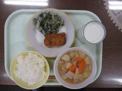 今日の献立は、ごはん、牛乳、ソフトカレイフライ、よごし、じゃがいもの中華煮込みです。