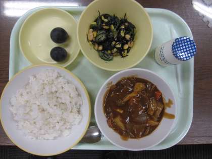 今日の献立は、麦ごはん、牛乳、たべキリンハヤシ、大豆とひじきのサラダ、巨峰、飲むヨーグルトです。