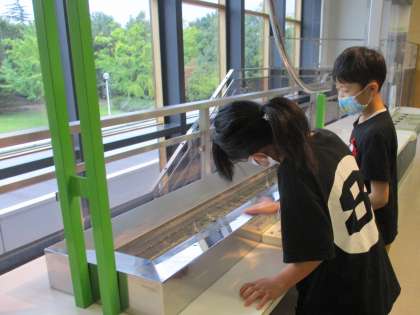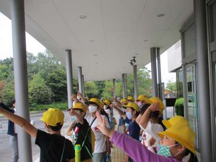 入館前に、方角を確認しました。子供たちは、方角を上手に答えていました。また、館内に入ると、1階や2階の見学をしました。恐竜や水ハープに人気がありました。