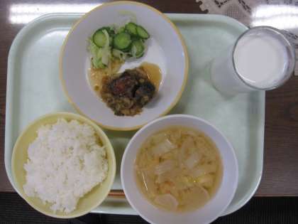 今日の献立は、ごはん、ぶりのてり煮、きざみあえ、具だくさん汁です。