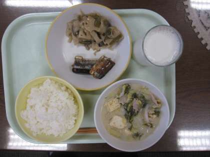 今日の献立は、ごはん、牛乳、さんまのマーマレード煮、れんこんのきんぴら、ごま豆乳鍋です。