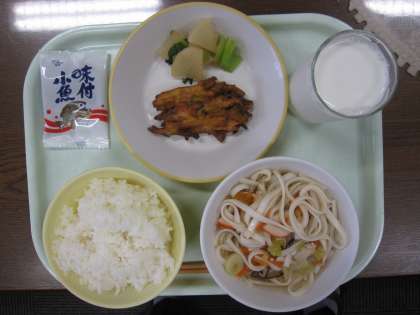 今日の献立は、ごはん、かしわうどん、えごま入りかきあげ、華風あえ、味付け小魚です。
