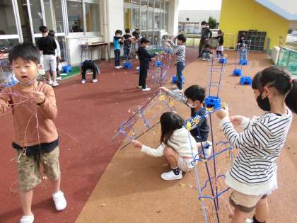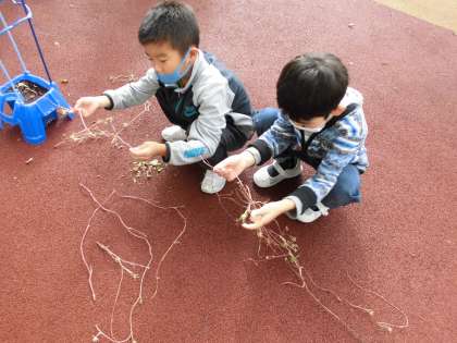 生活科で育てたあさがおのつるを使って、リースの土台作りをしました。友達と協力して、支柱に巻き付いたつるを外したり、つるを輪っかにしてモールで止めたりしました。