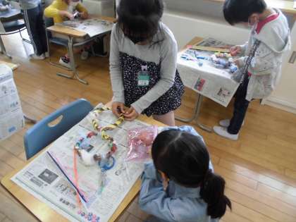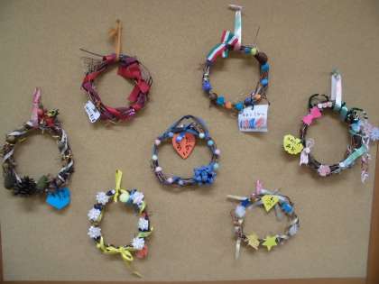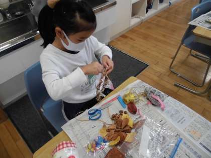 生活科では、先週作ったリースの土台に飾り付けをしました。土台にリボンを巻き付けたり、松ぼっくりやドングリをつけたりして、オリジナルのリースが完成しました。大切に育ててきたあさがおが、素敵なリースになり、子供たちはとても嬉しそうでした。