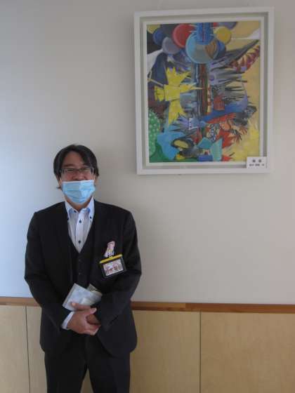 船木校長先生は、10年ほど前(まだ旧校舎たった頃)、水橋中部小学校に勤務しておられました。先生の写真の右上にあるのが、当時学校に寄贈された絵画「喃語(なんご)」です。「喃語(なんご)」とは、赤ちゃんが発する2つ以上の音からなる声だそうです。先生は油絵が専門だそうですが、絵画は、視聴覚室の前に展示してあるので、鑑賞してください。