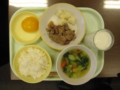 今日の献立は、ごはん、牛乳、豚肉のワイン煮、こふきいも、カレースープ、もも缶 です。