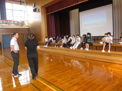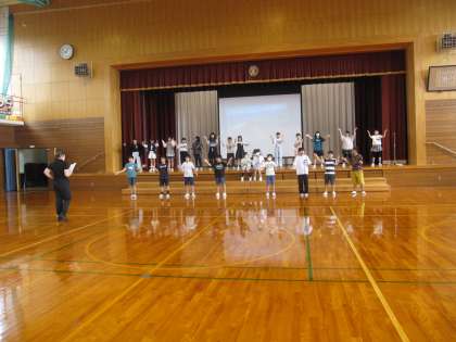 学習発表会の練習を体育館で行っています。英語のせりふがあるのでイマージョンALTも加わります。