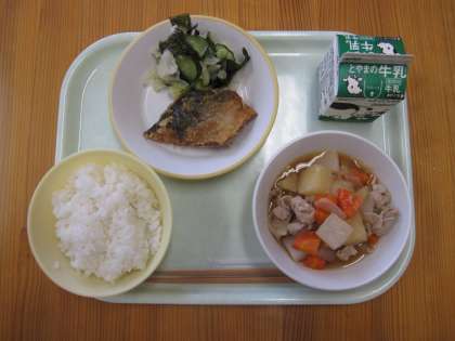 今日の給食は、ごはん、牛乳、さばの竜田揚げ、酢の物、豚肉の炒め煮です。