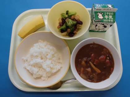 今日の給食は、ごはん、牛乳、たべキリンハヤシ、ビーンズサラダ、バナナです。