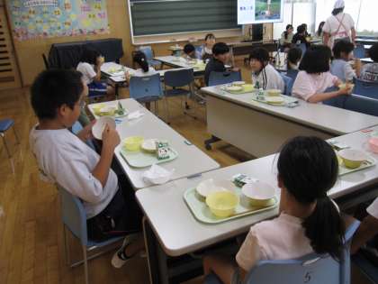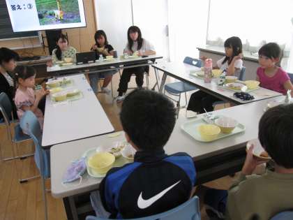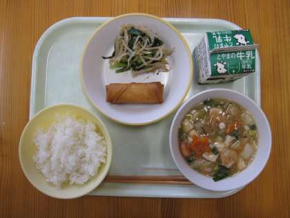 今日の給食は、ごはん、牛乳、春巻き、小松菜のごまびたし、えびと豆腐のうま煮です。今日は白団3〜6班のファミリー会食がありました。