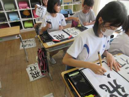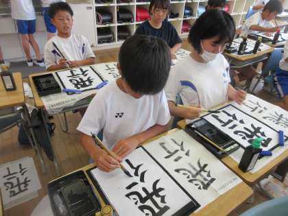 書写では、「用紙にあった文字の大きさを考えて書こう」という課題で「飛行」と書きました。一画目のスタート位置で文字の大きさが決まることや、画の長さが文字の大きさを決めることなどに気付いた子供たちは、手本の文字の大きさと自分の字の大きさをよく見比べながら慎重に書いていました。