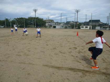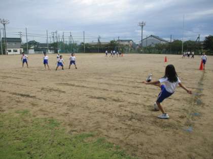 ベースボール型の運動として、ティーボールからキックベースに移行しました。ティーボールで学んだルールや動き方を生かして、新たな学習に取り組んでいます。