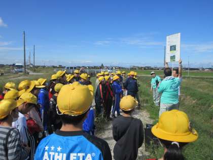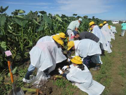 学校で説明していただいたスマート農業が行われている畑やドローンで成育状況を把握する様子を見学しました。また、里芋の収穫体験もしました。