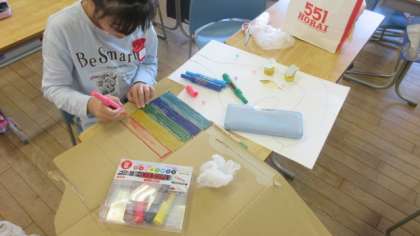 「作って あそぼう うごく おもちゃ」の学習では、設計図をもとに自分の動くおもちゃをつくっています。それぞれが動きを確認しながら、楽しんで活動しています。
