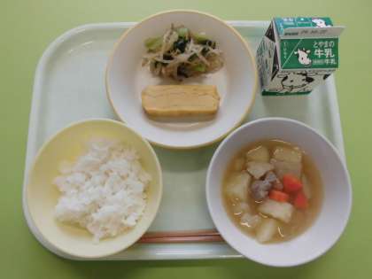 今日の給食は、ごはん、牛乳、厚焼き卵、チンゲンサイソテー、ポトフです。
