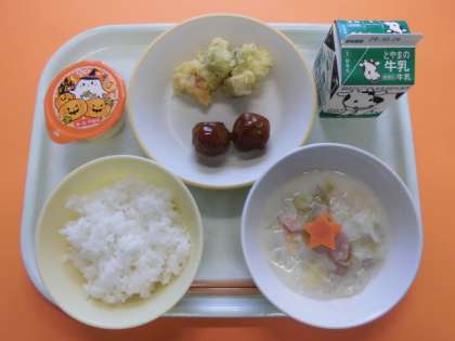 今日の給食は、ごはん、牛乳、ミートボール、チーズおさつ、豆乳野菜スープ、パンプキンババロアです。