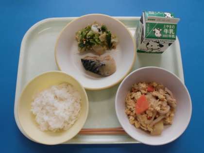 今日の給食は、ごはん、さばのみそ煮、いり大豆和え、卵とじです。