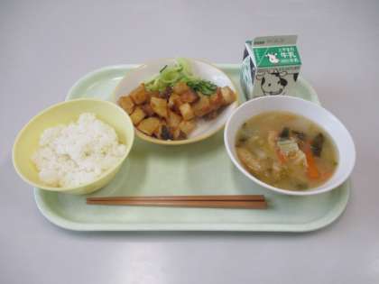 今日の給食は、ごはん、みそ汁、魚とじゃがいものあげ煮、きざみ和え、牛乳です。