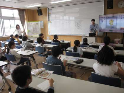 外国語活動の時間です。アルファベットのビンゴをしていました。耳をすませてしっかりと発音を聞いていました。