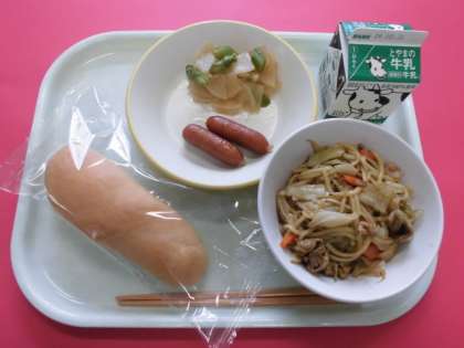 今日の給食は、減量コッペパン、牛乳、あらびきウインナー、大根サラダ、焼きそばです。