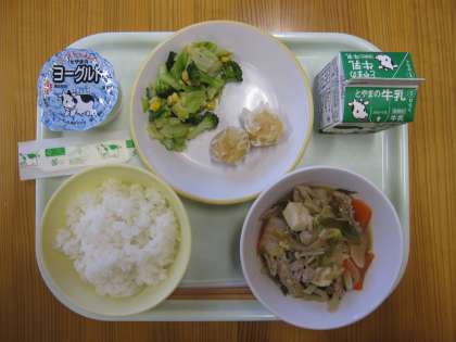 今日の給食は、ごはん、牛乳、にんじんシューマイ、コーン和え、豚すき焼き、ヨーグルトです。