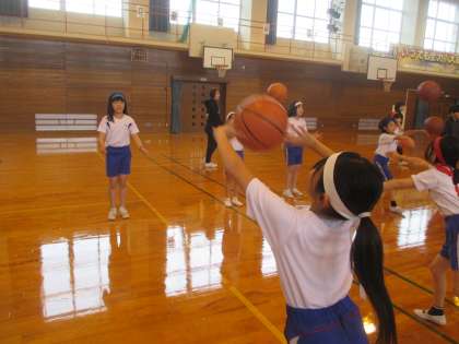 富山グラウジーズのアカデミーコーチの方に来ていただき、バスケットボールについて教えていただきました。色々な体の動きや基本的なボールの扱い方を教えてもらい、とても楽しく活動できました。