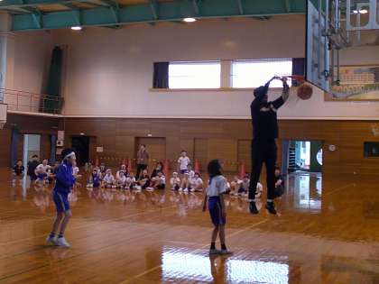 最後はコーチ1名対子供たちの試合がありました。その中で豪快なダンクシュートを見せていただいたことで、子供たちからは大きな歓声があがっていました。貴重な体験をさせていただき、ありがとうございました。