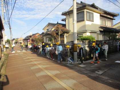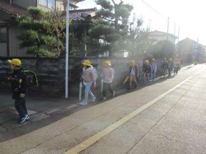 さわやかな秋晴れの朝となりました。子供たちは一列で安全に気を付けて登校しています。