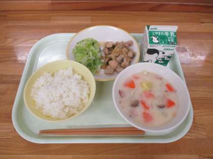 今日の給食は、ご飯、牛乳、あっさりチキン、ゆでキャベツ、秋の香りシチューです。