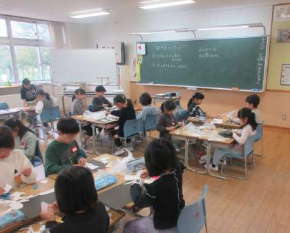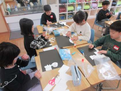 図画工作科「はさみのあーと」では、自由にはさみを動かしてできた形から想像して絵を作りました。切り取って残った方の画用紙の面白さにも気付き、組み合わせながら作品づくりに夢中になっていました。