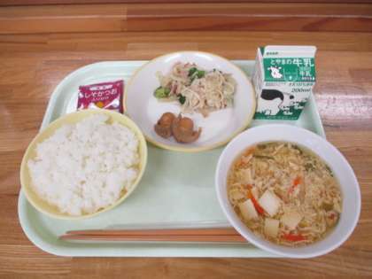 今日の給食は、ごはん、牛乳、切り干し大根のペペロンチーノ、ほたての照り焼き、かきたま汁、しそかつおふりかけです。