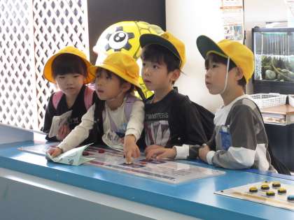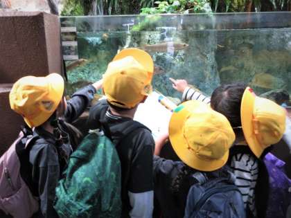 水橋地区4校の1年生は、魚津水族館に行ってきました。水族館に着くと、すぐに合同のグループをつくり、自己紹介をし合いました。少し恥ずかしそうな様子も見られましたが、ビンゴカードを持って水族館を見学し始めると、顔を寄せ合って一生懸命魚の様子を観察していました。
