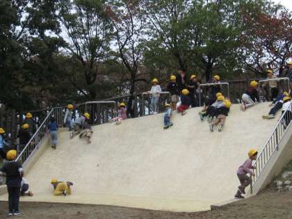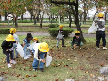 昼食の後は、水族館横の公園で「秋見つけ」や遊具遊びを楽しみました。大きなどんぐりの木の下に落ちているどんぐりの実を袋いっぱいに拾い集める子供、大きな滑り台で思い切り遊ぶ子供等、それぞれに楽しい時間を過ごしました。
