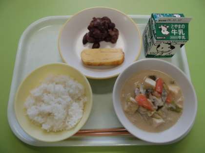 今日の給食は、ごはん、牛乳、厚焼き卵、煮豆、ごま豆乳鍋です。