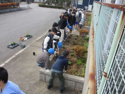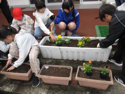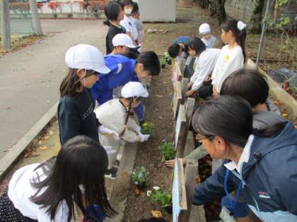 今日のファミリー活動は、6年生が中心となり、パンジーの花苗やチューリップの球根をファミリーごとに仲良く植えました。この後のお世話もファミリーでしていきます。