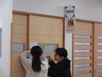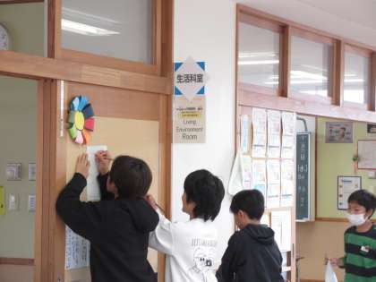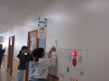 その後、学校にあるいろいろな教室の英語名を探す活動をしました。3人グループで手分けをして26の教室名を英語と日本語で用紙に書いていました。