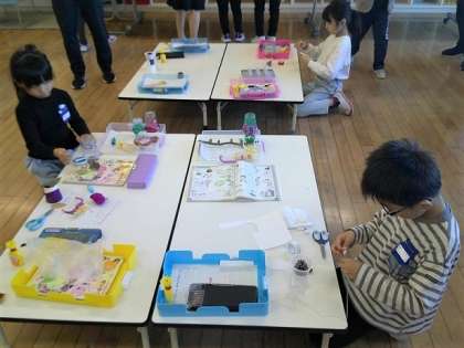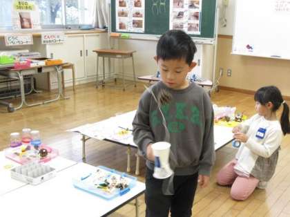 子供たちが10月から集めてきた落ち葉やどんぐり、ススキ等の「秋のたからもの」を使って、いろんなおもちゃや飾り、楽器をつくっています。つくっては遊び、遊んではさらに工夫し、友達と教え合って楽しく活動しています。みんなでつくったもので、思い切り遊ぶ「秋まつり」を目指して、休憩時間も時間を惜しんで活動しているところです。