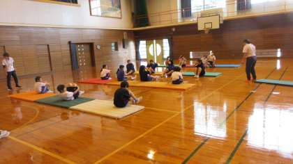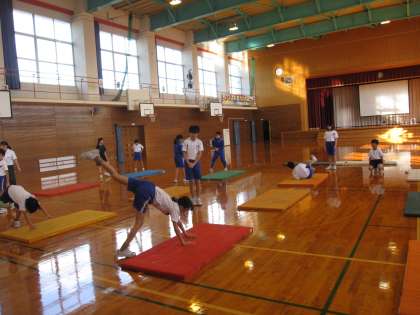 市スポーツ協会から講師の方をお招きして、マット運動を教えていただきました。学年に応じた技を実演を交えながら、分かりやすく教えていただいたことで、子供たちは上達を実感できたようです。