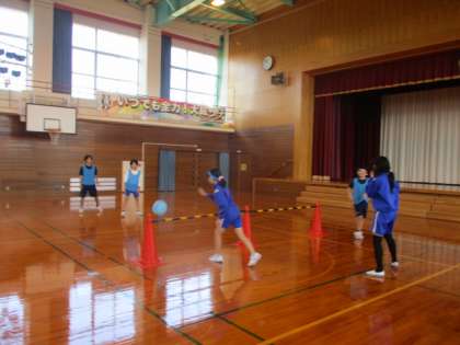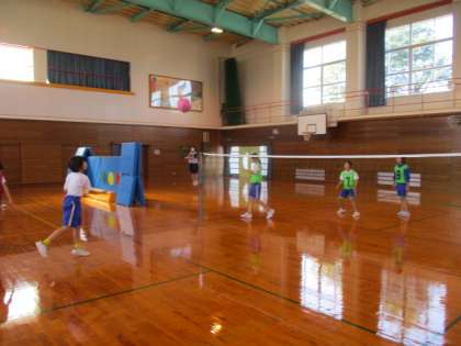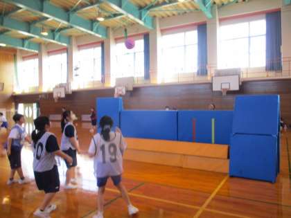 体育科でワンバウンドゲームというネット型のゲームに取り組んでいます。自分たちでルールを決めると同時にネットが3種類のときのそれぞれの戦い方も併せて考えながら進めています。