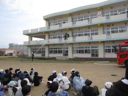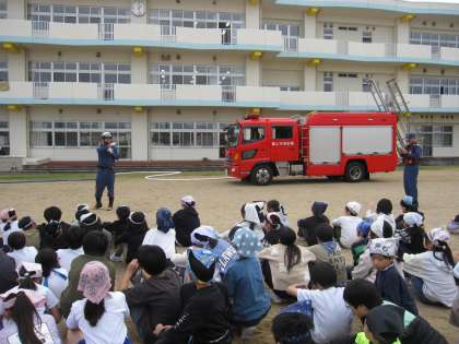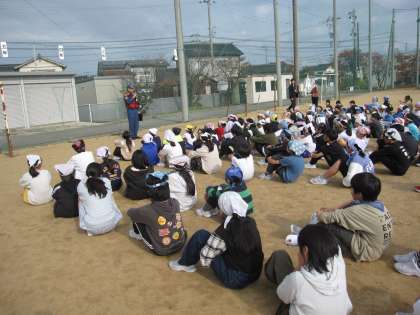 水橋消防署の方に避難訓練の様子を見ていただきました。縦割り清掃中の訓練でしたが、リーダーを中心にグラウンドへ避難することができました。