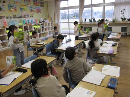 国語の時間、リズムに合わせて音読をしていました。低学年の時期は、声に出して読むことが大切です。