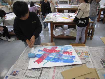 図工の時間です。ローラーを使って色を付けていました。このあとどんな作品になるのでしょう。