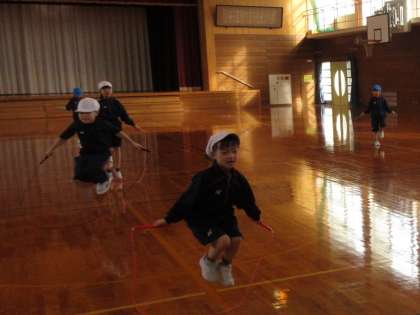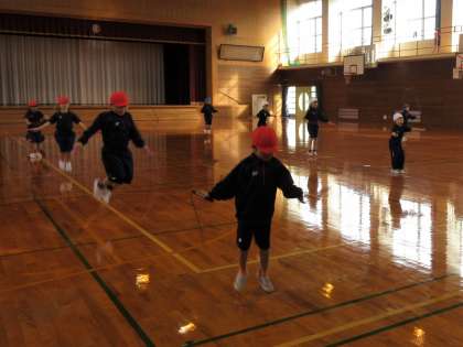 肌寒い季節になり、1年生は、体育の授業時間の始まりに、準備運動として縄跳びを行っています。前跳びをすると、もう50回以上連続して跳ぶことができる友達がおり、みんなの目標になっています。