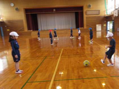 その後は、ボールけりの運動に取り組んでいます。まずは、自分の思う方向に蹴ることができるよう、がんばっています。