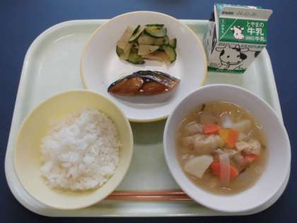 今日の給食は、ごはん、牛乳、ふくらぎの照り焼き、大根のえごまサラダ、具だくさん汁です。
