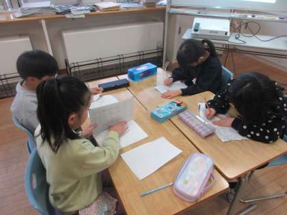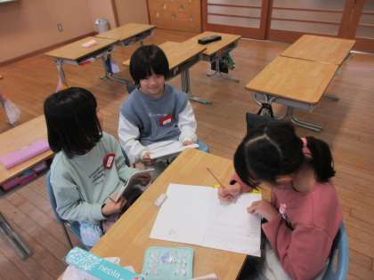 生活科の学習で作ったおもちゃで遊ぶ「おもちゃランド」に1年生を招待する計画を立ててました。それぞれの役割に分かれてセリフを考えたり、プログラムや招待状を書いたりしました。