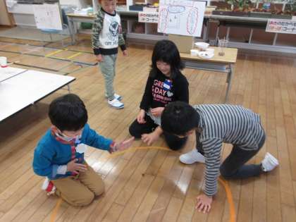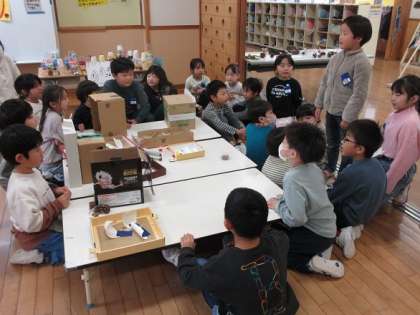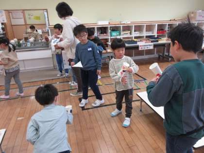 「松ぼっくりで牛乳パックたおし」や「オナモミダーツ」、「どんぐりごま」や「まつぼっくりけん玉」等、それぞれのコーナーに園児のみなさんが遊びに来てくれて、1年生も一緒になって楽しく遊ぶことができました。松ぼっくり人形やマラカス等をお土産としてプレゼントし、帰る頃にはみんなとってもなかよしになりました。