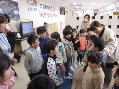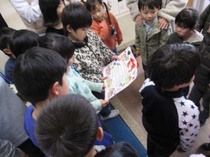 昼休みに水橋幼稚園のみなさんが来られました。先日、「秋のおもちゃまつり」に招待したので、そのお礼にメッセージを書いて持ってきてくれました。1年生もうれしそうです。「3学期にはまた遊ぼうね」と約束しました。