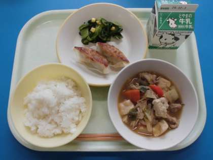 今日の給食は、ごはん、牛乳、焼き餃子、コーン和え、韓国風すき焼きです。