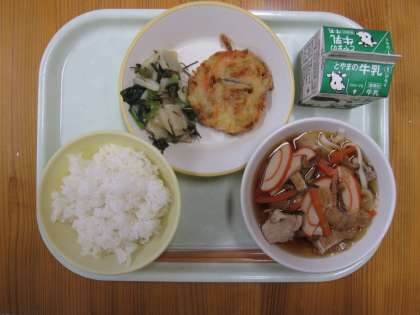 今日の給食は、ごはん、野菜かき揚げうどん、やちゃらです。